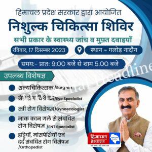स्वास्थ्य एवं परिवार कल्याण विभाग 17 दिसंबर को गलोड़ के हेल्थ वेलनेस सेंटर में बहु-विशेषज्ञ स्वास्थ्य मेले का आयोजन करने जा रहा है। मुख्य चिकित्सा अधिकारी डॉ. आरके अग्निहोत्री ने बताया कि इस शिविर में कई विशेषज्ञ डॉक्टर लोगांे का चैकअप करेंगे।