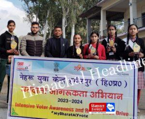नेहरू युवा केंद्र हमीरपुर, युवक मंडल बधानी की ओर से मतदाता जागरूकता अभियान के तहत भोरंज व बमसन ब्लॉक के बधानी में सेमिनार व पोस्टर मेकिंग प्रतियोगिता का आयोजन किया गया। कार्यक्रम में मुख्य अतिथि के रूप मे रा०वा०मा०विद्यालय बधानी के प्रधानाचार्य उपस्थित रहे। प्रधानाचार्य ने युवाओं को मतदान के लिए जागरूक किया। पोस्टर मेकिंग की स्पर्धा में टौणी देवी से प्रथम स्थान पर रिया, द्वितीय स्थान पर वंदिता व तृतीय स्थान पर आदिती शर्मा रही। वहीं भोरंज ब्लॉक से प्रथम स्थान पर आर्यन द्वितीय स्थान पर अपुर्वा व तृतीय स्थान पर जानवी रहे।