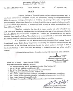 भारी बारिश व भूस्खलन के कारण हिमाचल प्रदेश के सभी सरकारी व निजी शिक्षण संस्थान 7 सितंबर तक बंद रहेंगे