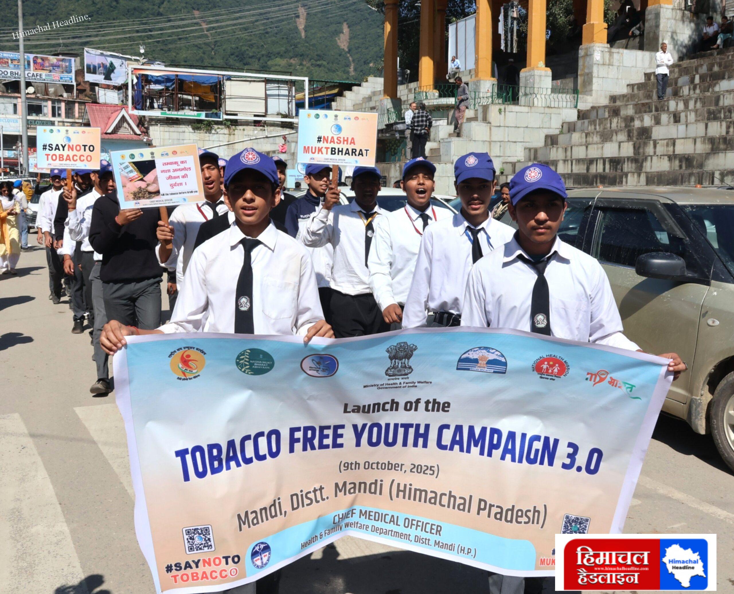 तंबाकू मुक्त युवा अभियान 3.0 का शुभारंभ आज मंडी जिला में उत्साहपूर्वक किया गया। सेरी मंच से स्कूली बच्चों द्वारा निकाली गई जागरूकता रैली को अतिरिक्त जिला दंडाधिकारी डॉ. मदन कुमार ने हरी झंडी दिखाकर रवाना किया। रैली से पहले बच्चों को जीवन में कभी भी किसी भी प्रकार के तंबाकू उत्पाद का सेवन न करने, अपने परिवार, मित्रों और परिचितों को भी तंबाकू का सेवन न करने के लिए प्रेरित करने तथा तंबाकू से होने वाले दुष्प्रभावों से समाज और पर्यावरण की रक्षा में योगदान देने की शपथ दिलाई गई।