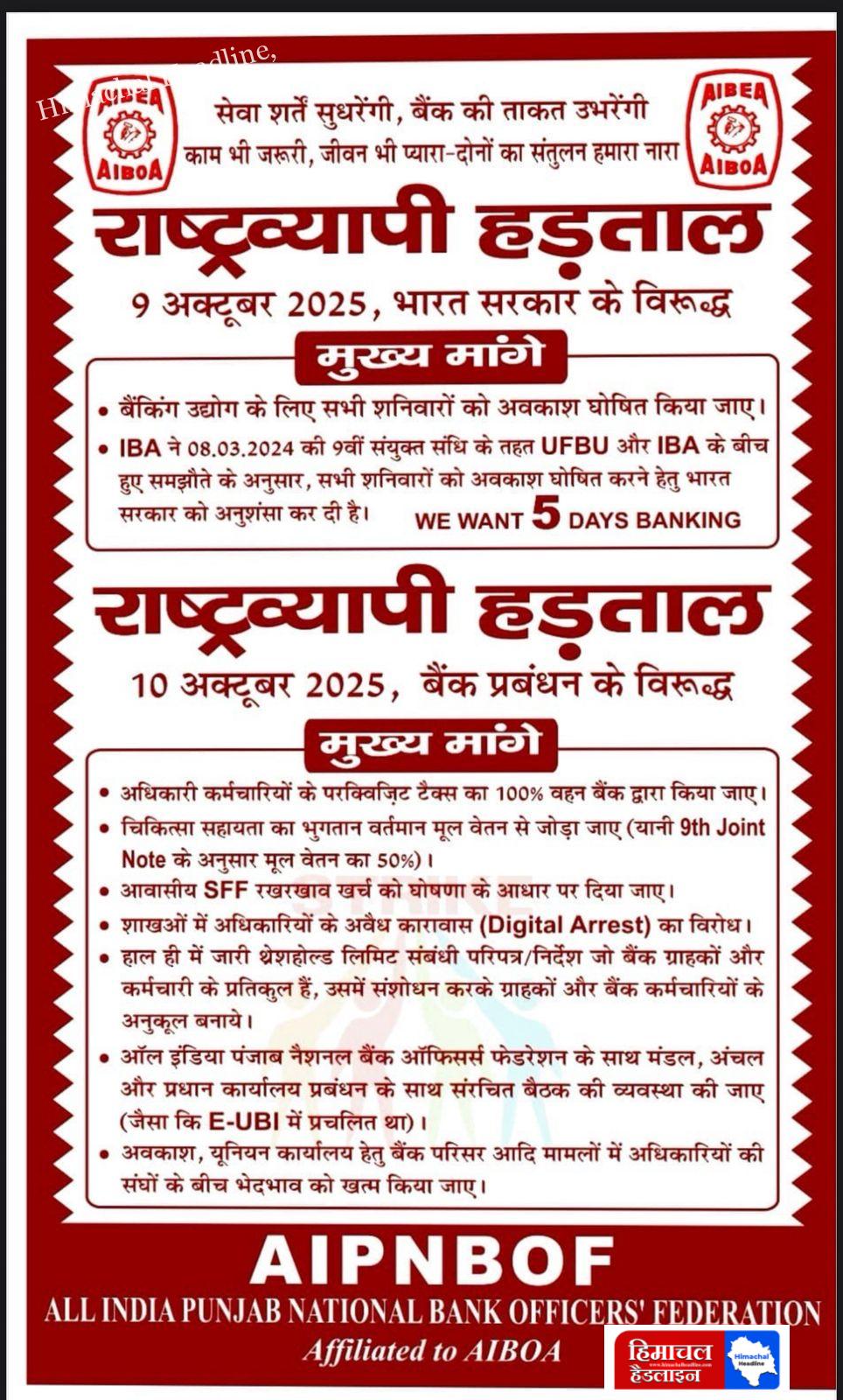 10 अक्टूबर 2025 को बैंक हड़ताल अखिल भारतीय पंजाब नेशनल बैंक ऑफिसर्स फेडरेशन कल हड़ताल पर!